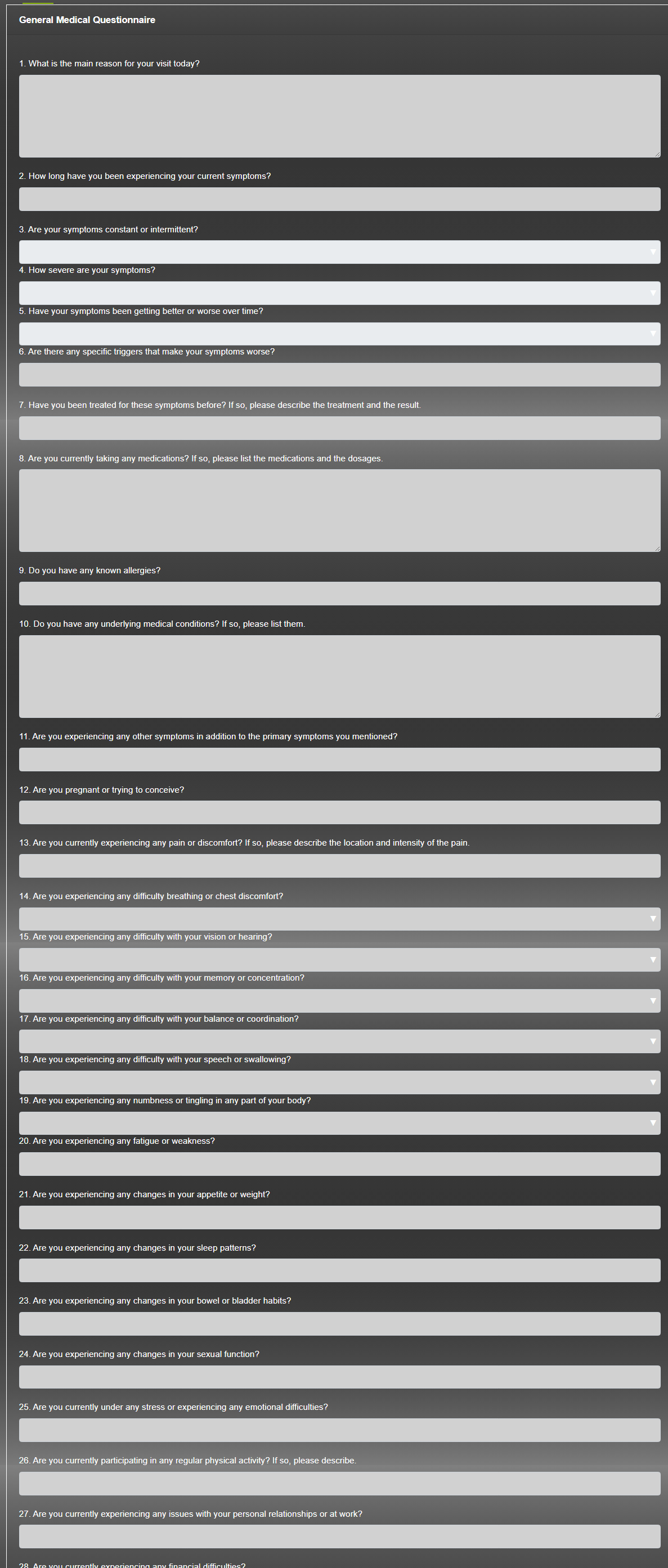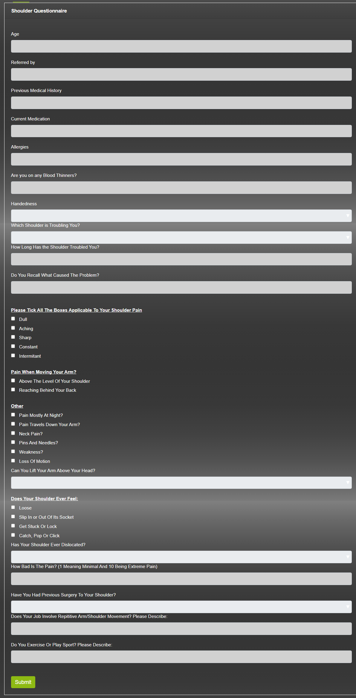 Leverage our clinician specific features including body part specific forms and questionnaire. Review some example forms.